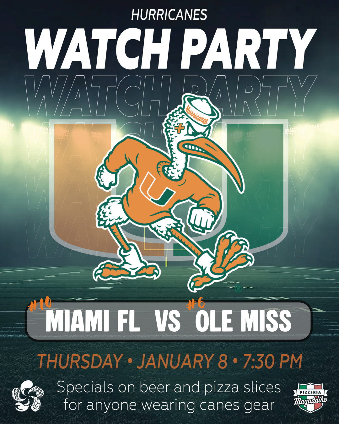 Come cheer on your Miami Hurricanes as they face Ole Miss on their road to the College Football National Championship. This semi-final matchup kicks off at 7:30pm. Sound will be... |
