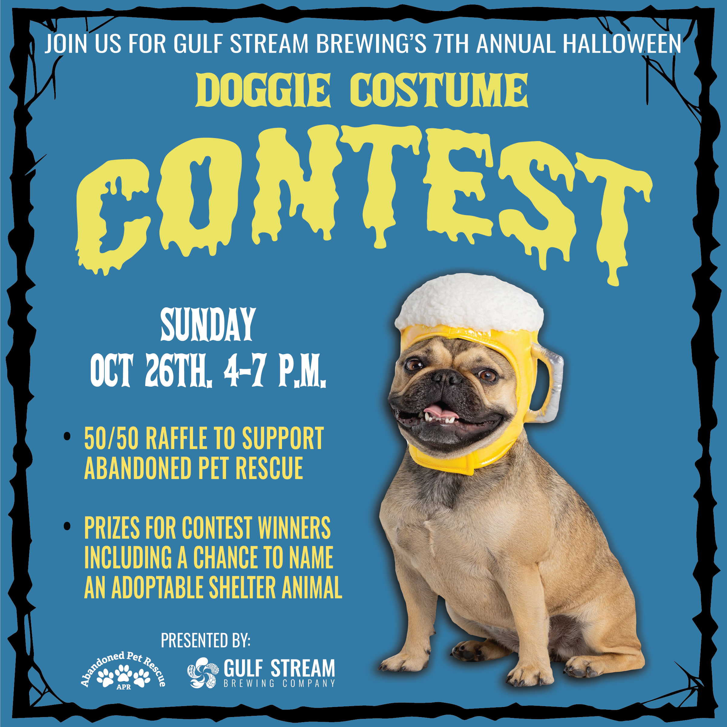 Scary, adorable, artsy, creative… all types of costumes are welcome. There will be prizes for the winning costumes, but let’s be clear, all the doggies are winners in our eyes! The contest starts @ 5pm.